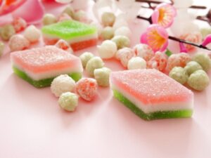 色は四季を表すとされ、一年を通して幸せであるよう願いが込められています。特に関東では甘いポン菓子が、関西では塩味のおかきが主流です。また、地域によってさまざまな種類があるのも特徴のひとつです。